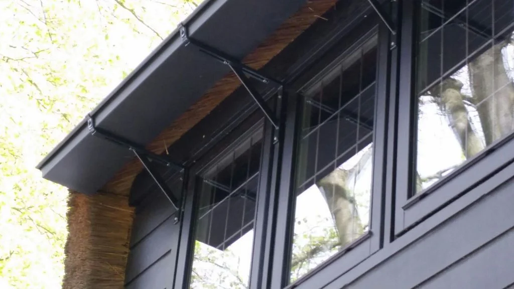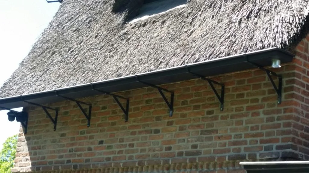 Dit huis had eerst geen dakgoten, maar de klant had erg last van doorslaande gevels. Het voegwerk ging steeds kapot, vanwege het opspattende water. Hij wilde alleen geen koperen goten en daaro hebben we naar een alternatief gezocht. Uiteindelijk zijn het zwarte zinken goten geworden die bestand zijn tegen rietzuur.