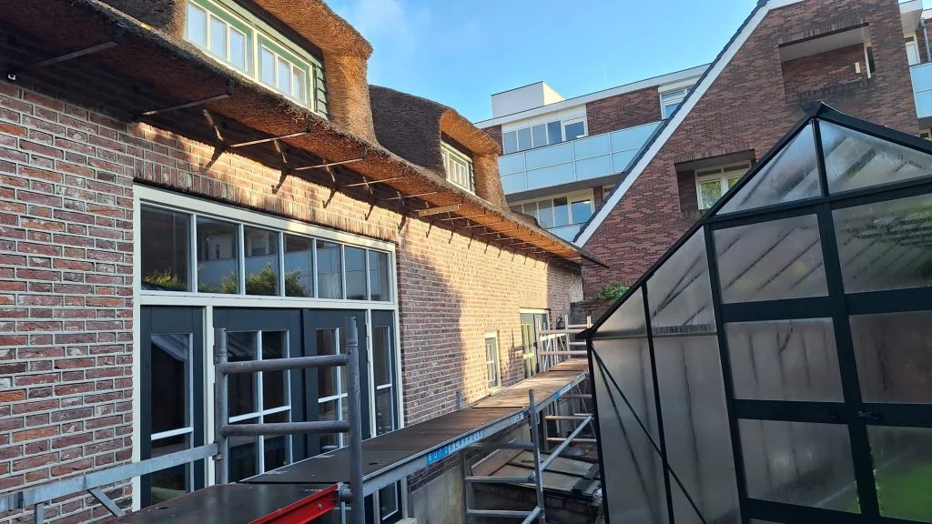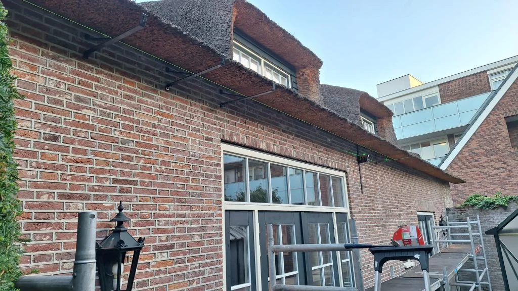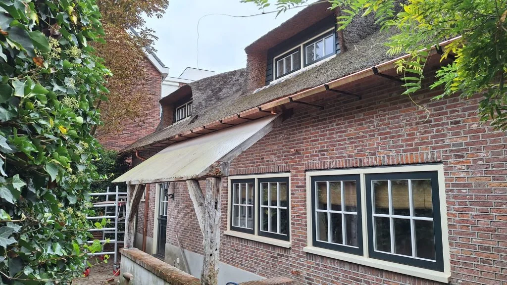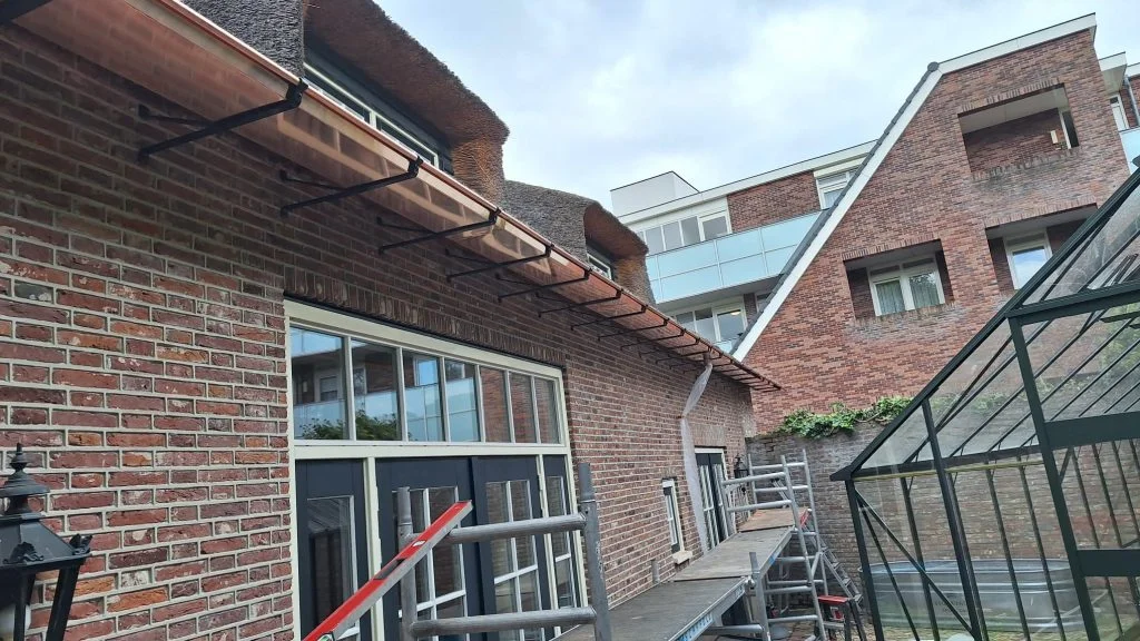 De klant wilde i.v.m. met het vele vocht in de kelder graag een dakgoot, maar wel in stijl en de gootbeugels mochten niet teveel in het zicht. De koperen regenpijpen moeten nog worden gemonteerd.