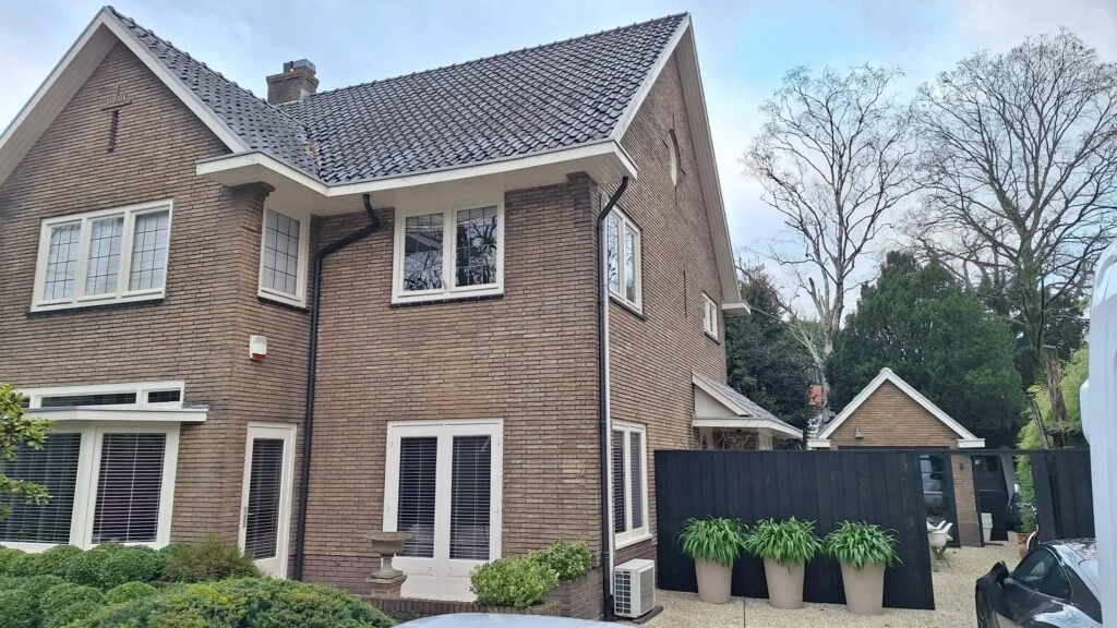 Zinken goten en zwarte regenpijpen – Hilversum Van deze woning zijn alle zinken goten vervangen. Niet alleen de gebruikelijke bakgoten, maar ook de verholen goten die aan de rand van het dak onder de pannen lopen.Daarnaast hebben we de PVC regenpijpen vervangen voor zwarte zinken regenpijpen.